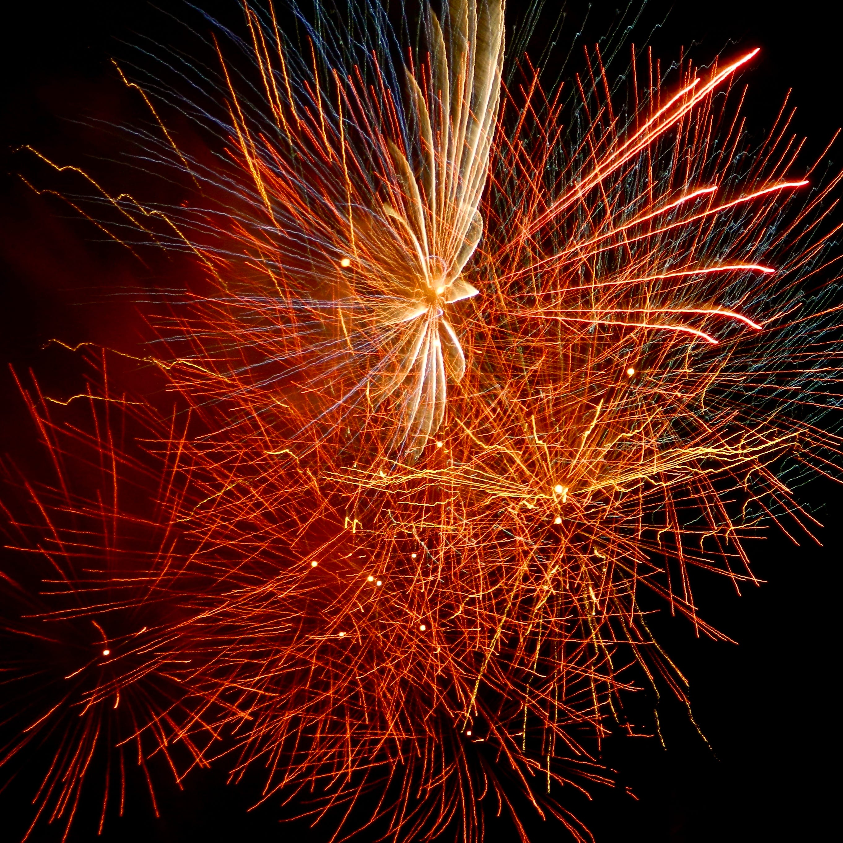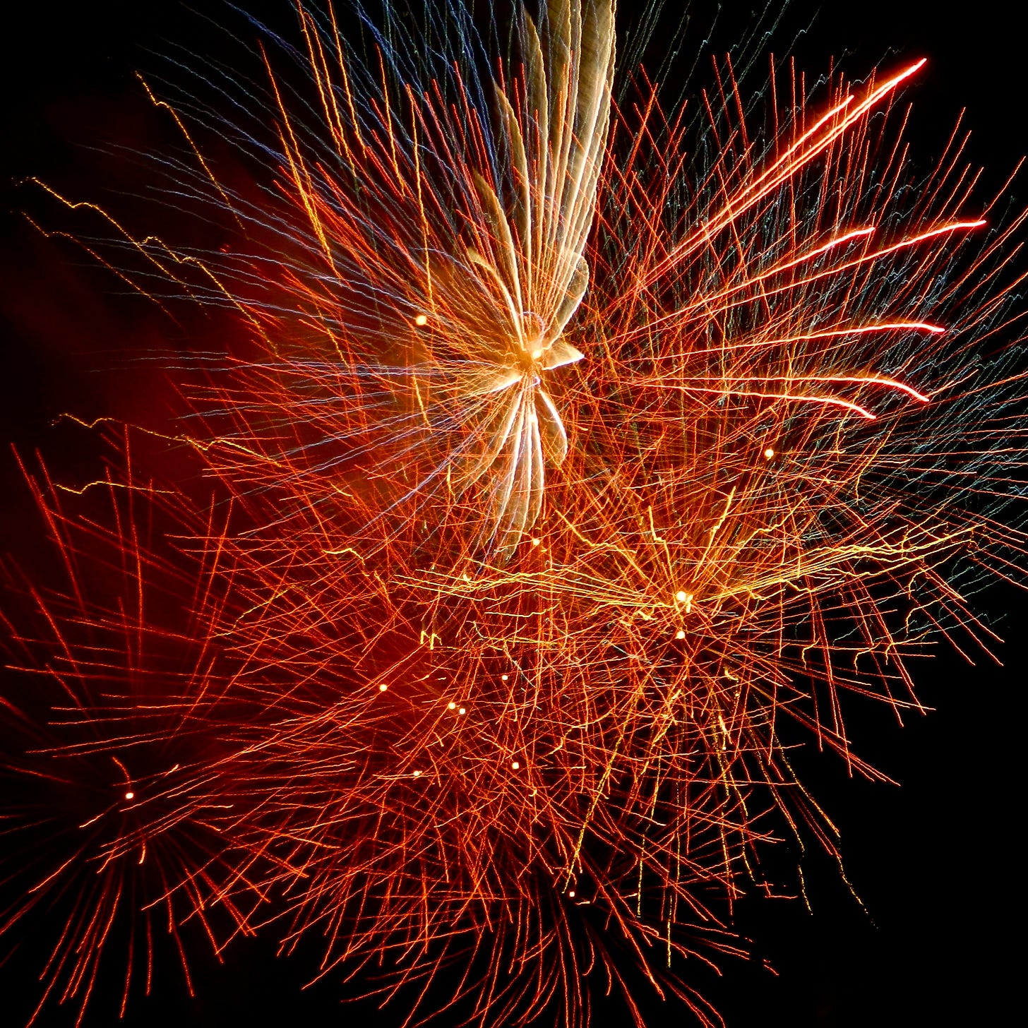 Image: bright red and yellow fireworks in a dark sky.