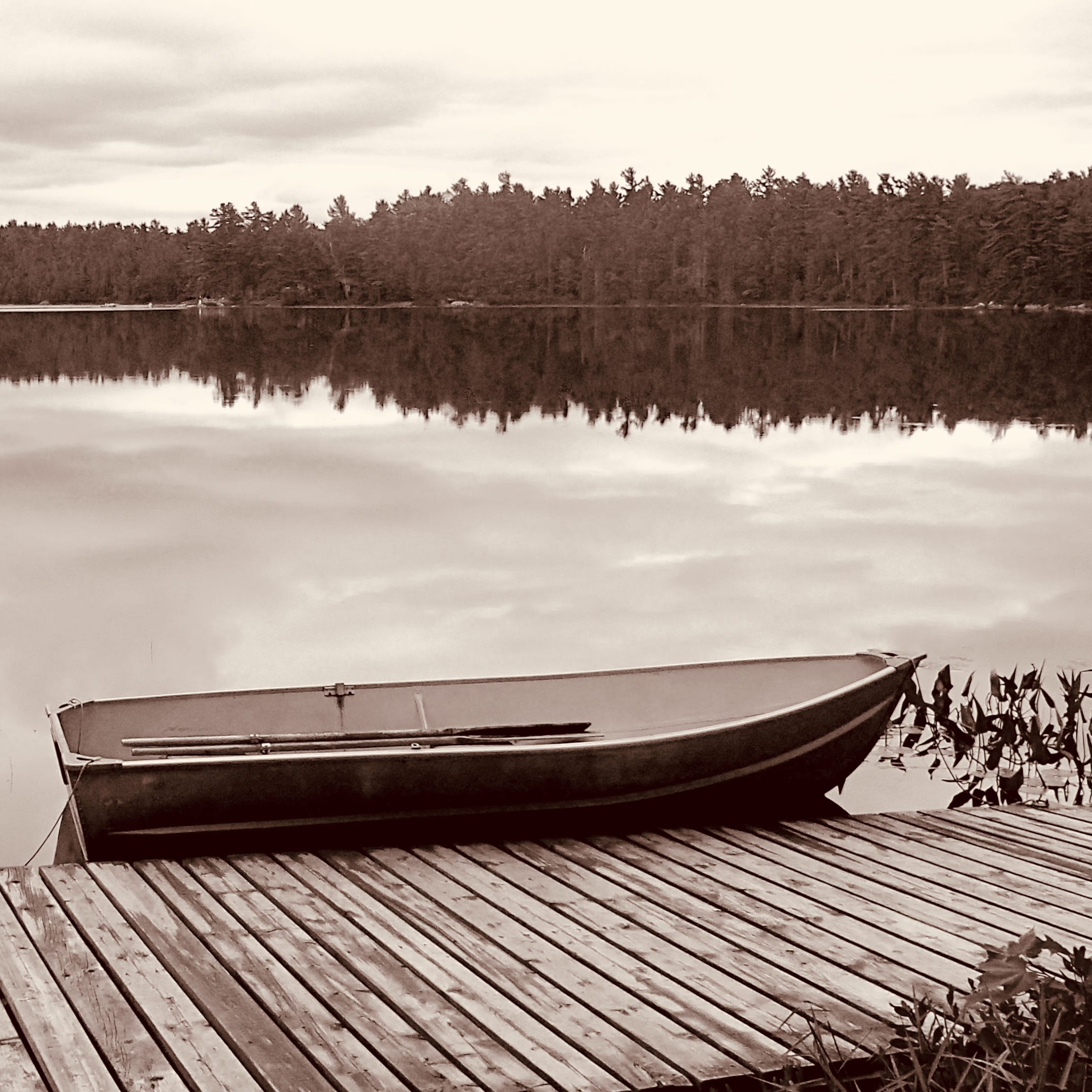 Image: empty canoe with oars docked on a tree-lined lake.