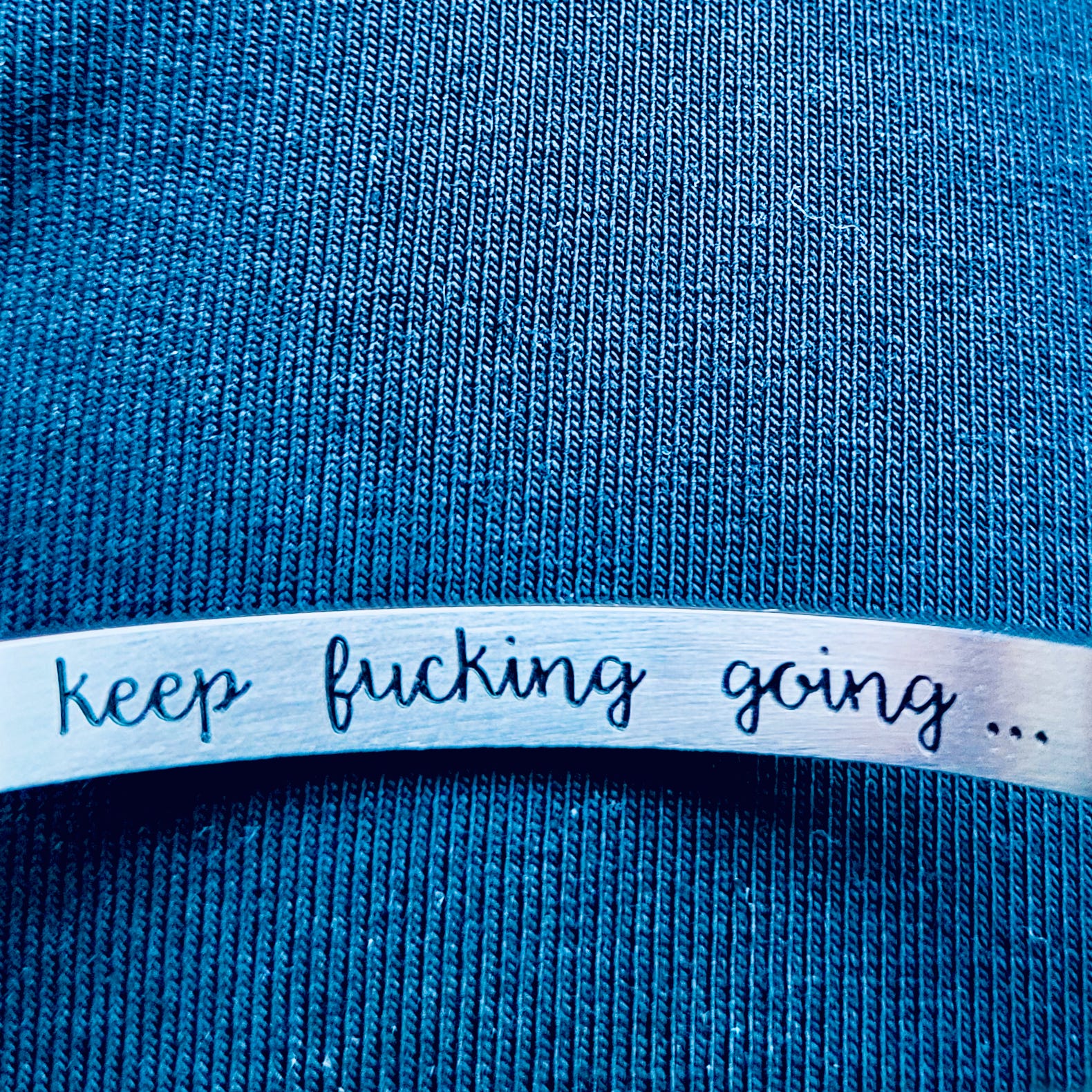 Image: inside of a silver bracelet engraved with the words “keep fucking going…” on blue fabric background.